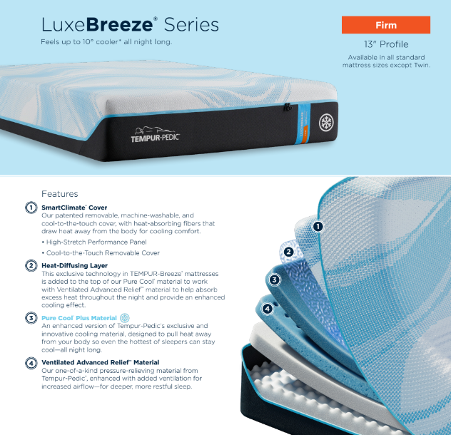 •13-INCH LUXEbreeze® QUEEN MATTRESS: The all-new TEMPUR-LUXEbreeze® feels up to 10 degrees cooler throughout the night while delivering maximum pressure-relieving power – so you’ll sleep deeper, cooler, longer.